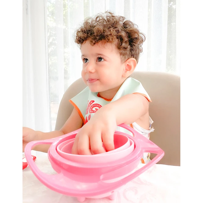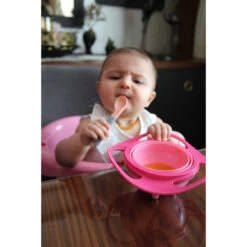 Die babyjem Wunderschale fällt aufgrund ihrer kräftigen Farben mindestens ebenso ins Auge wie dank ihres ungewöhnlichen Designs. Die wahre Überraschung – eine Schale mit Schwenkmechanismus – verbirgt sich jedoch im Inneren der Konstruktion. Die Wunderschale von babyjem macht ihrem Namen alle Ehre. Die an ein Küchensieb mit geschwungenem Aufsatz erinnernde Konstruktion beherbergt in ihrem Inneren eine leuchtend gelbe Schale. Diese Innenschale besitzt ein 360-Grad-Schwenkdesign. Mit anderen Worten: Egal wie man die Außenschale dreht – die Innenschale bleibt an ihrem Platz. Babybrei, Obststückchen und Co. können damit nicht kleckern oder herausfallen. Auch die Außenschale erleichtert Babys das selbstständige Essen. Die robuste Schüssel besitzt vier kurze Standbeine für kippelfreien Stand auch auf unebenem Untergrund. Ergonomisch geschwungen, erleichtert die rundumlaufende Halterung das Greifen und Festhalten. Ein fest schließender Deckel macht aus der Essschale eine kühlschranktaugliche Aufbewahrungsdose. Die Wunderschale mit ihrem leuchtend gelben Kern lenkt Babys Aufmerksamkeit auf natürliche Weise auf das Essen. Das langlebige, von babyjem auf Produktsicherheit getestete, Material ist spülmaschinenfest und einfach zu reinigen.