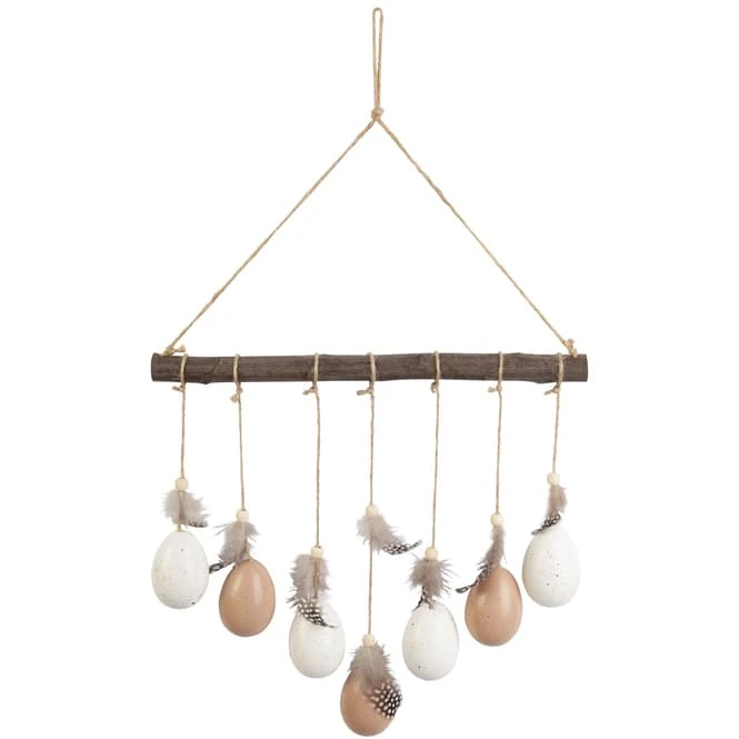 Mit dem niedlichen Dekohänger könnt ihr eure vier Wände binnen Sekunden in ein wohliges Osterambiente tauchen und zeigen, dass ihr ein Händchen für echte Trends habt! Dieser eignet sich nämlich ideal, um der Fantasie beim frühjährlichen Schmücken freien Lauf zu lassen und grenzenlosen Dekospaß zu erleben. Er besteht aus Holz, misst ca. 30 x 4 x 50 cm und kommt mit einer Reihe dekorativer Eier samt Federn daher, welche sich bei Bewegung zart im Wind wiegen. Mithilfe der natürlichen Farben fügt sich der tolle Deko-Ast nahtlos in jeden Raum ein und ist somit genau das Richtige, um die blühende Jahreszeit stilecht willkommen zu heißen. Also schnappt ihn euch und holt euch das Osterfest mühelos in euer Zuhause!