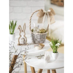 Endlich ist der Winter vorüber und der sehnsüchtig erwartete Frühling klopft mit sprießenden Zweigen an die Tür. Da ist es auch bis zum Osterfest nicht mehr weit, was echten Trendsettern ganz sicher ein Lächeln auf die Lippen zaubert. All diejenigen, die nicht genug von fröhlicher Osterdekoration bekommen, welche dem letzten Winterfrust im Nu den Garaus macht, kommen mit dem niedlichen Dekohasen vollends auf ihre Kosten! Dieser ist aufgrund der liebevollen Gestaltung nämlich nicht nur ein echter Blickfänger – nein – mit seinem klassischen Weiß fügt er sich zudem nahtlos in jeden Raum ein. Er besteht aus Keramik, ist 9 x 5,5 x 10,5 cm groß und insbesondere dank dem hinreißenden Schlappohr der absolute Augenschmaus. Also schnappt euch den tollen Osterhasen und erlebt grenzenlosen Dekospaß!