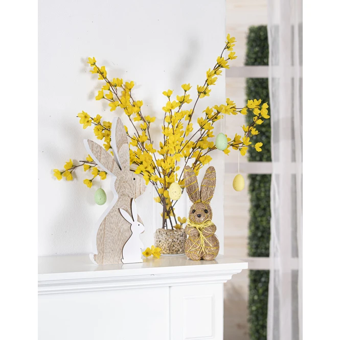 Echte Dekofans haben es sich lange herbeigesehnt und nun steht es endlich vor der Tür: das Osterfest. Zu diesem Anlass gehören Heim und Hof natürlich herrlich geschmückt, damit der Osterhase mit großer Freude zu Ihnen nach Hause kommt. Aus diesem Grund eignen sich die niedlichen Dekohasen perfekt, um das Zuhause im Handumdrehen in wohliges Osterambiente zu tauchen. Das Element besteht aus Holz, misst 16 x 39 cm und ist vor allem aufgrund der liebevollen Gestaltung ein österliches Highlight. Mit seinen dezenten Farben fügt es sich nicht nur nahtlos in jeden Raum ein, sondern ist überdies auch genau das Richtige für all diejenigen, die eine schlichtere Dekoration bevorzugen. Also schnappen Sie sich das hinreißende Hasenpärchen und lassen Sie Ihrer Kreativität beim Schmücken freien Lauf!