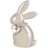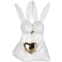 Ein jeder hat ihn sich herbeigesehnt und nun steht er endlich vor der Tür: der Frühling. Zu diesem Anlass gehören Heim und Hof natürlich stilecht hergerichtet, damit der Osterhase mit großer Freude und vielen bunten Eiern ins Haus kommt. Aus diesem Grund eignen sich die niedlichen Dekohasen ideal, um im Nu ein wohliges Osterambiente aufkommen zu lassen. Sie sind aufgrund der liebevollen Gestaltung nicht nur echte Hingucker, sondern überdies auch genau das Richtige, um die Fantasie beim österlichen Dekorieren freien Lauf zu lassen. Das Element besteht aus Keramik, misst 11,5 x 8 x 17,5 cm und ist insbesondere dank der harmonischen Kombination aus klassischem Weiß und zeitlosem Gold ein dekoratives Highlight. Damit fügt es sich nahtlos in jeden Raum ein und ist zudem auch das ideale Stück für all diejenigen, die eine schlichtere Dekoration bevorzugen. Also schnappen Sie sich das hinreißende Hasenpärchen und dekorieren Sie munter drauflos!