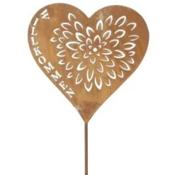Trendsetter, aufgepasst! Wenn ihr auf der Suche nach trendiger Gartendeko seid, welche die triste Winterstimmung im Handumdrehen vertreibt, haben wir hier genau das Richtige! Der niedliche Pflanzenstecker sieht mit dem liebevoll gestalteten Herz sowie der stylischen Rostoptik nicht nur hinreißend aus, sondern heißt darüber hinaus auch eure Gäste auf besondere Weise willkommen. Er besteht aus robustem Metall, ist 75 cm hoch und zieht, platziert neben Terrasse, im Garten oder Beet, mühelos alle Blicke auf sich. Ganz gleich, ob ihr ihn alleine oder zusammen mit weiterer stylischer Gartendekoration in Szene setzt – dieser Blumenstecker verbreitet überall eine gemütliche Wohlfühlatmosphäre, von der ihr und eure Lieben ganz sicher nicht genug bekommt.