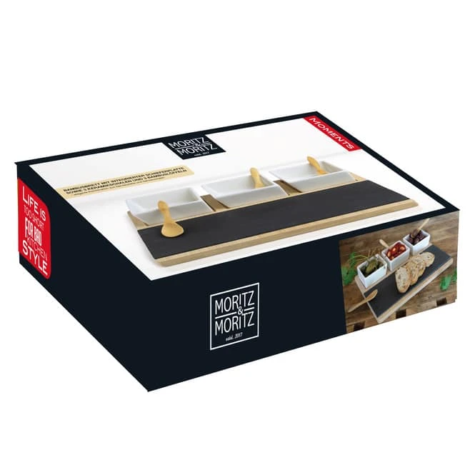 - Lieferumfang: 1 Set, bestehend aus Teller, 3 Dipschälchen sowie 3 Servierlöffelchen
